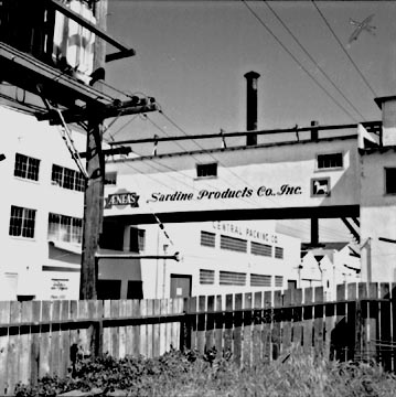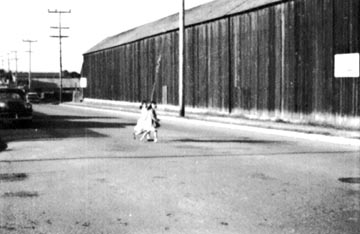 Two girls crossing Foam Street at Hansen's lumber yard. |