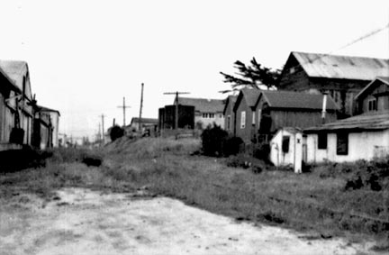 Tracks behind the Wing Chong. On the right: the 3 cannery worker shacks saved by the City of Monterey, and above and beyond them, the fishmeal barn Steinbeck describes as the Palace Flophouse. |