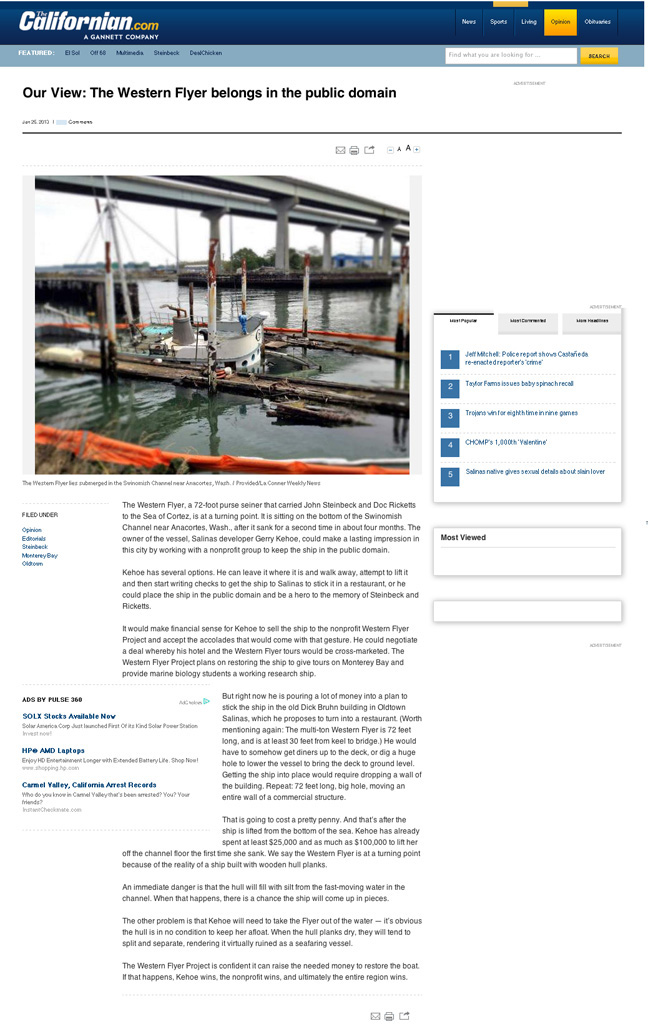Websites Designed and Maintained by THE HISTORY COMPANY THE CANNERY ROW FOUNDATION www.canneryrow.org (graphic design by Bridges Design) BOMBARDIER'S LOUNGE WWII Big Band Jazz on KRML www.BombardiersLounge.com T.A. Wolfson Design www.TAWolfsonDesign.com Artful Interiors END OF LIES Th Nadjik Pheromone www.EndofLies.com THE WESTERN FLYER PROJECT www.WesternFlyerPorject.org |