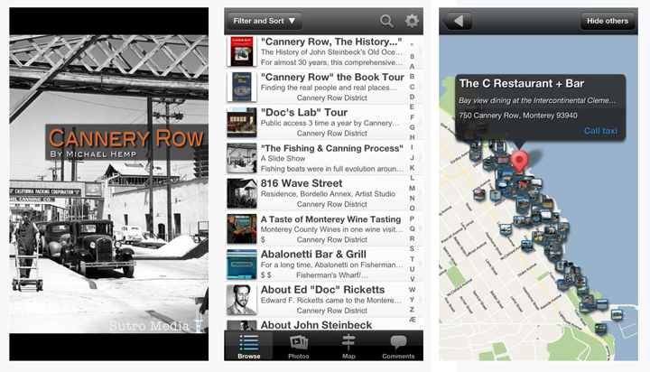 ...and get our 5-star iTunes Travel App —a $2.99 download value— FREE! Filled with only the best and most memorable things to see and do on today's Cannery Row: including finding the Old Row of John Steinbeck's 1945 classic "Cannery Row"—with hundreds of historic "then and now" archival images from the famous Pat Hathaway Historical Photo Collection. Be sure to provide your e-mail; our app will be gifted to you from the iTunes App Store. Check it out. |