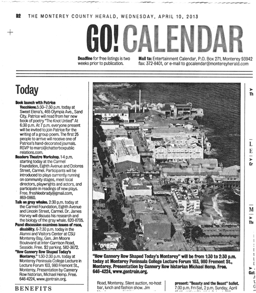 OCT 15TH Tuesday 2:00 – 4:00 Osher Cannery Row History Course (Opt) Cannery Row Tour OCT 8TH Tuesday 10–12 Osher Cannery Row History Course (Class 3) @ CSUMB OCT 5TH Saturday 9:00 – 6:00 Cannery Row Foundation Lab Tours OCT 1ST Tuesday 10–12 Osher Cannery Row History Course (Class 2) @ CSUMB SEPT 24TH Tuesday 10–12 Osher Cannery Row History Course (Class 1) @ CSUMB JULY 16TH Tuesday 2:00 – 4:00 Cottages of Carmel Community Event JUNE 25TH Tuesday 11:30 SIRs #104 Aptos at Severino’s MAY 14TH Tuesday 6:00 PM – Monterey Yacht Club MAY 11TH Saturday 9:00 – 6:00 Cannery Row Foundation Lab Tours MAY 4TH Saturday 1:30 – 2:30 National Steinbeck Center Doc’s Lab Tour 3:30 – 4:30 National Steinbeck Center Doc’s Lab Tour MAY 3RD Friday 2:30 – 3:30 National Steinbeck Center Doc’s Lab Tour "After listening to you yesterday, I think you do some of the best talking, if not the best talk, I've heard on Ricketts yet..." —Don Kohrs, Hopkins Marine Station of Stanford University, Pacific Grove; his site: http://library.stanford.edu/news/finding-edward-flanders-robb-ricketts APRIL 24TH Wednesday 6:30 PM Moss Landing Marine Labs Moss Landing "You shared so many interesting stories and secrets about the area that I had never heard before. I certainly won't look at the town the same way. I haven't had so many people come up after one of our events to tell me how much they enjoyed it." —Brynn Hooten, Friends of MLML APRIL 24TH Thursday 11:30 SIRs Lodge #5 Michael's Sunnyvale APRIL 10TH Wednesday 1:30 – 2:30 Monterey Peninsula College Gentrain APRIL 11TH Thursday 11:30 SIRs Lodge #153 Elks Lodge Sunnyvale APRIL 20TH Saturday 2:30 Keynote Speech: Wildlands Fire Litigants Conference Hyatt Regency Monterey JAN 10TH Wednesday 11:30 SIRs Lodge #28 Park Lane Monterey "On a 1 to 10 scale, this guy's a 12+" |