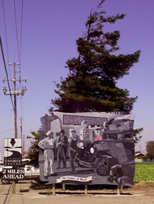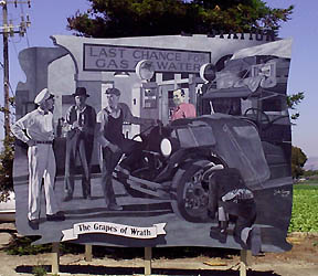 On the outkskirts of Salinas, John 'Steinbeck's home town, a mural of a roadside service station annouces "Grapes of Wrath." |