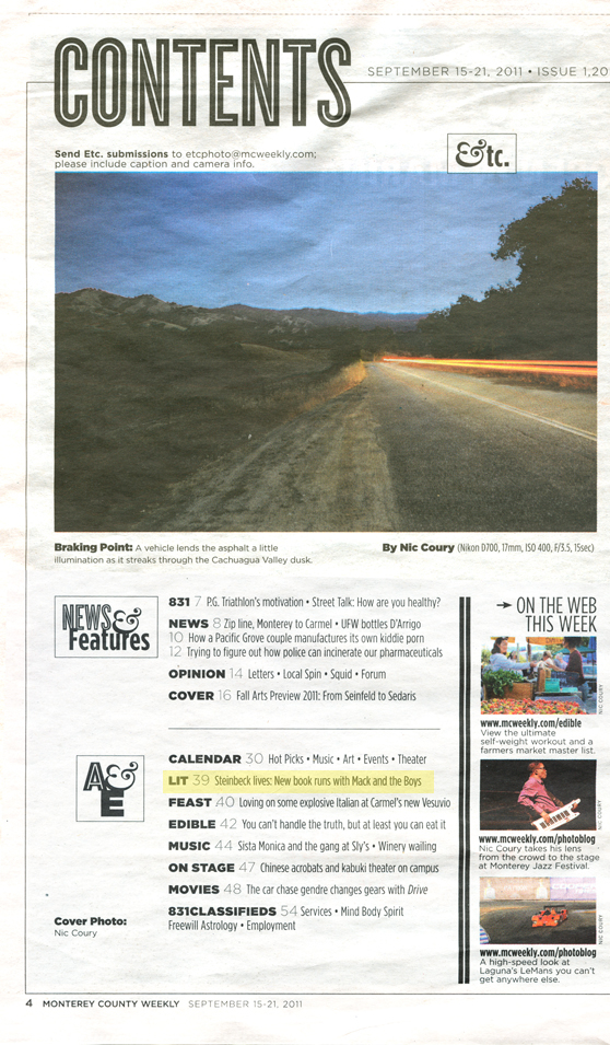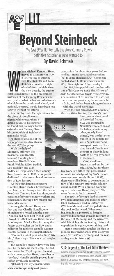 BEYOND STEINBECK The Last Otter Hunter tells the story Cannery Row’s definitive historian always wanted to. By David Schmalz Thursday, September 15, 2011 When Michael Kenneth Hemp moved to Monterey in 1979, it is tempting to imagine that Doc Ricketts and John Steinbeck breathed a sigh of relief from on high. Over the next decade, the author established himself as the preeminent historian of the Cannery Row era, and nearly all of what he has recorded (much of which can be considered a local, and national, treasure) would have been lost forever without his efforts. A writer by trade, Hemp’s interest in the piece of shoreline was piqued while researching a dining guide. To his surprise, he found that no major books existed about Cannery Row history outside of Steinbeck’s namesake novel. “I stepped into one of the last opportunities like this in the world,” Hemp says. With the help of Monterey attorney Bob Rosenthal and (locally famous) founding board members like Ed Haber, Frank Wright, Eldon Dedini, Lou Rudolph and Max Tadlock, Hemp formed the Cannery Row Foundation in 1982, a nonprofit dedicated to the research and preservation of Row history. As the Foundation’s Executive Director, Hemp made a breakthrough a year later when he organized the first of five Great Cannery Row Reunions, a celebration of former cannery workers and fisherman featuring a fire muster and bartender races. Among the alumni Hemp met that day was Charlie Nonella, one of Steinbeck’s “Mack and the Boys” (Nonella had been best friends with Harold Otis Bicknell, aka Gabe, the man who inspired Mack). Despite being the fastest can-catcher on the Row and a collector for Ricketts, Nonella was not exactly popular in the neighborhood. “I’ve met a lot of guys who didn’t like him,” Hemp says. “He was a real roughneck.” But Nonella’s meaner days were long past by the time he met Hemp – he had been sober for 20-plus years. Blessed with a memory that Hemp describes as “perfect,” Nonella quickly proved himself an invaluable resource. “[Charlie] was my constant daily companion for about four years before he died,” Hemp says, “and everything [he] told me checked out.” (Hemp conducted about 1,000 interviews in the ‘80s, often eight to 10 hours a day.) In 1986, Hemp published the first edition of his Cannery Row: The History of John Steinbeck’s Old Ocean View Avenue, a culmination of his research to date. Yet there was one great story he was unable to fit in, and he has been aching to share it with the world ever since. With the just-released SUR: Legend of the Last Otter Hunter, that story’s time has come. A short novel of historical fiction, SUR was inspired by Nonella’s recollections of his father, who (among other, mostly illegal things), was the last otter hunter in the region. He was a “crack shot” and an expert boatman. For a time he and Charlie ran the surf at Bixby in longboats to deliver dynamite to the beach. Otters had been largely wiped out by the mid-1800s, but for those like Nonella’s father that possessed an intimate knowledge of Big Sur’s remote coves (no road was built until 1937), there was still a living to be made: At the turn of the century, otter pelts sold for about $2,000. With a million hairs per square inch, says Hemp, they are “the most fantastic fur in the world.” The spirit of Hemp’s lead character (William Manning) was modeled after Clint Eastwood’s lead in "Unforgiven" (William Munny), and Hemp dedicates the book to Eastwood. When reading "SUR," it is a pleasure to imagine Eastwood’s charged, gravelly restraint in the voice of Manning, and the narrative, which is rich with fascinating, historical exposition, is a quick, entertaining read. Hemp’s postscript touches on Big Sur pioneer Howard Sharpe’s 1935 discovery of an “extinct” otter colony, and the rest, as they say, is history. SUR: Legend of the Last Otter Hunter is available at www.amazon.com for $4.95 via Kindle, and can also be delivered to a smartphone, or to Amazon Cloud, where it can be read on a computer. For more, visit www.thehistorycompany.com. |